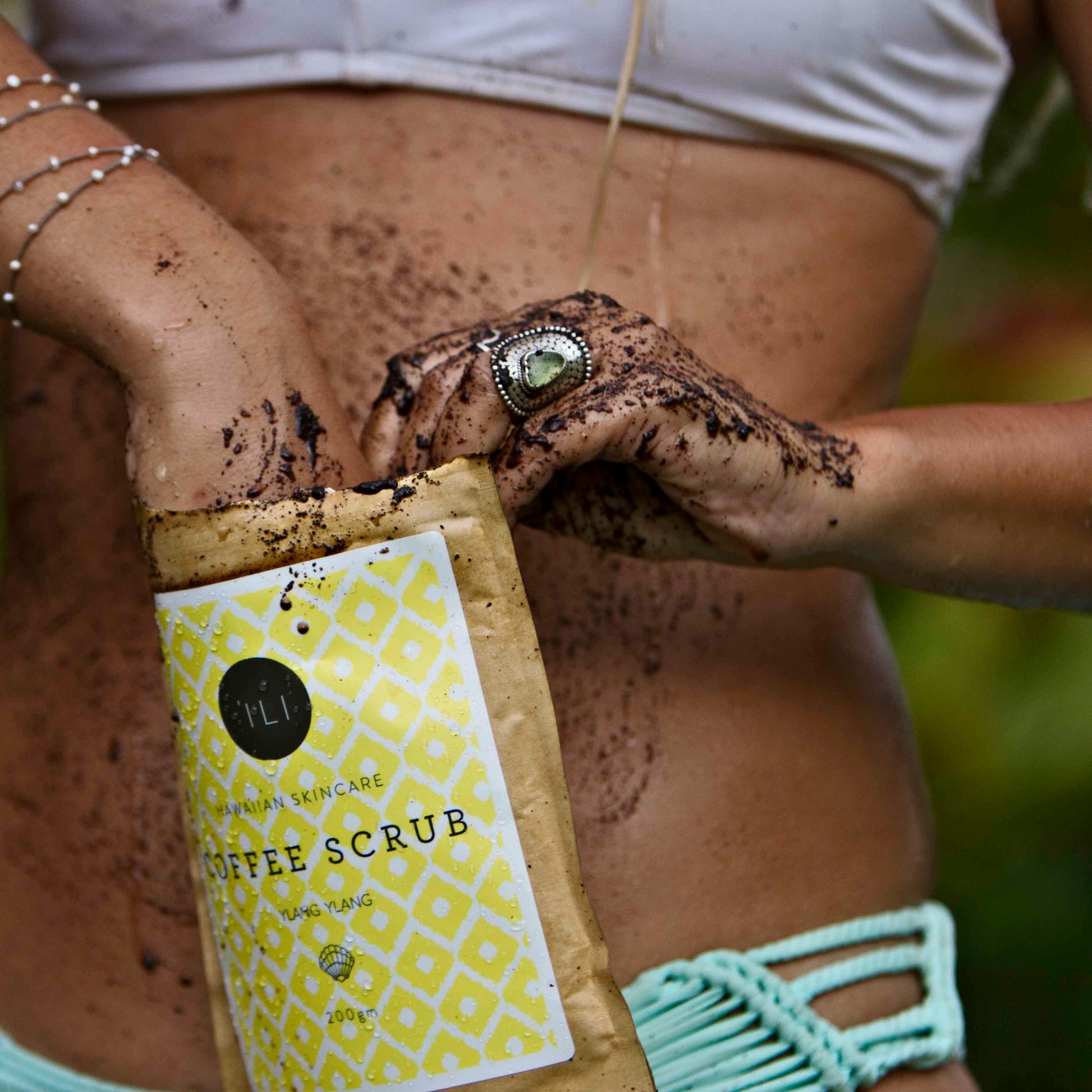 After dampening your skin, it’s best to turn the shower off, with a couple small handfuls of ‘Ili, scrub your entire body using moderate pressure in circular motions, loving every inch of your self. We recommend letting the product be on your skin for a minimum of five minutes—longer if you can. This gives all the amazing properties of our powerful ingredients time to do their thing. Rinse and repeat every few days.